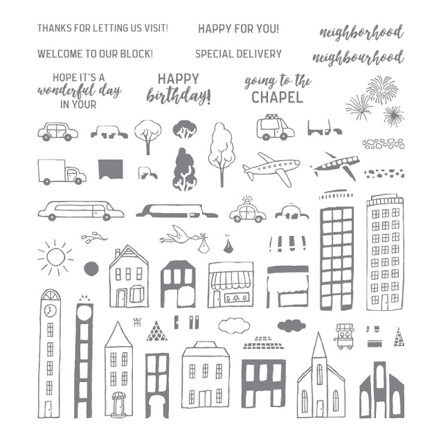 This is a cool set called In the City. This is a Host Set so its not available for general purchase, but redeemed through host rewards. But, you will LOVE it! You MUST get this. This is a cool 2- or 3-step stamp set. I had SOOOO much fun with this. I started stamping buildings in all different colours and I kept going ..... and going .... and LOVED it!